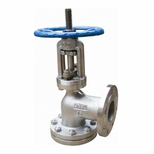 角式放料阀阀体为90度角,进出口法兰大小相同。阀体内腔装有耐冲刷、耐腐蚀的密封圈,在开启阀门瞬间,可以保护阀体不被介质冲刷、腐蚀,并对密封圈子进行特种处理,使表面硬度达到HRC25~40。阀座密封面与阀瓣密封面均堆焊有司太立硬质合金,密封副采用线密封,保证密封,保证密封的可靠性,并可防止结疤。阀瓣斜面于阀座角形成线密封,阀瓣阀瓣启闭时有手轮带动铜螺母,螺母带阀杆(上下运动有夹板定向,阀杆不会出现旋转)向反应釜内伸。底部法兰可拆卸,焊接到反应釜底部(注意:阀门必需是关必状态拆卸法兰)。